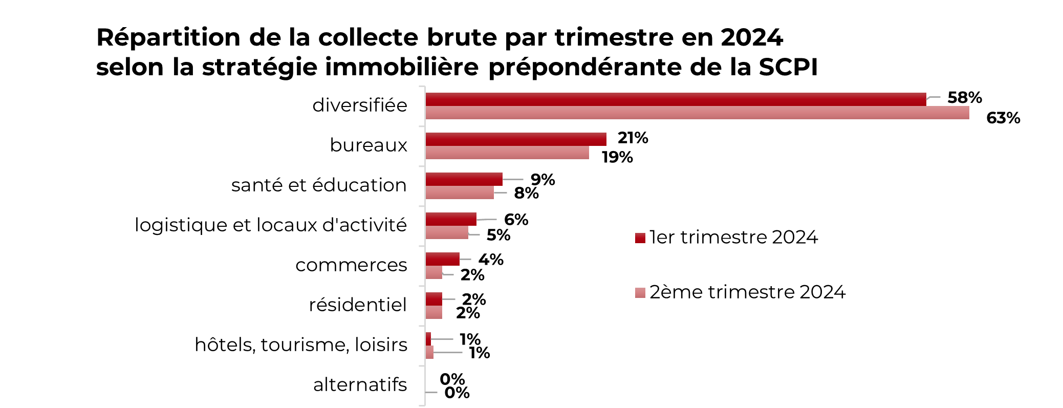 Au premier semestre 2024, la collecte brute des SCPI atteint 2,3 milliards €, un volume comparable à celui du dernier semestre 2023. Le deuxième trimestre 2024 totalise 1,2 milliard €, s’inscrivant en hausse par rapport au premier trimestre 2024. Les SCPI « diversifiées » réalisent 63 % de la collecte brute du deuxième trimestre. Elles devancent ainsi les SCPI à prépondérance « bureaux » (19 %), « santé et éducation » (8 %), « logistique et locaux d’activité » (5 %) et « commerces » (2 %). Les SCPI « résidentiel » et « hôtel, tourisme, loisirs » représentent quant à elles respectivement 2 % et 1 % du total des souscriptions.