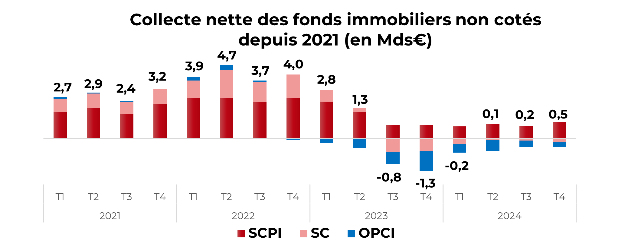 En 2024, la décollecte nette des OPCI grand public s’établit à -2 milliards € contre -3 milliards € en 2023.