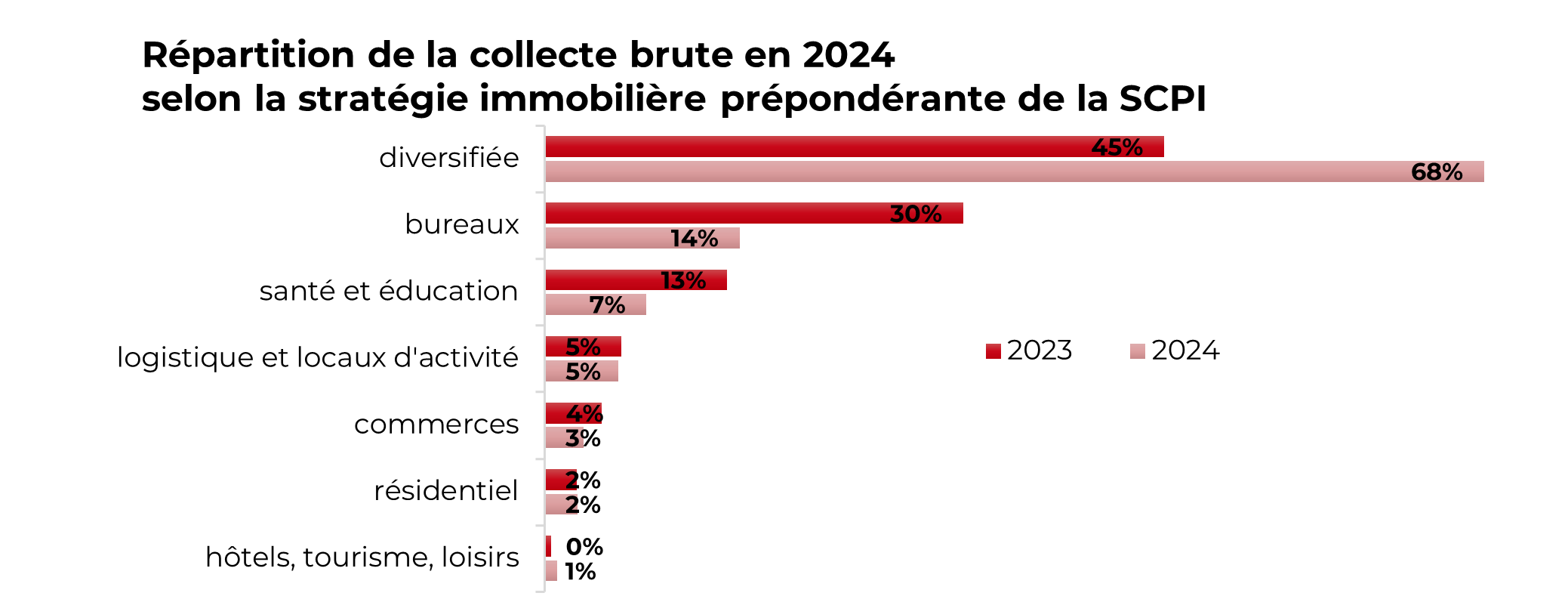 Les SCPI « diversifiées », qui représentent 20 % des SCPI en nombre, ont capté 68 % de la collecte brute de 2024. Elles devancent ainsi les SCPI à prépondérance « bureaux » (14%), « santé et éducation » (7 %), « logistique et locaux d’activité » (5 %) et « commerces » (3 %). Les SCPI « résidentiel » et « hôtels, tourisme, loisirs » représentent quant à elles respectivement 2 % et 1 % du total des souscriptions.