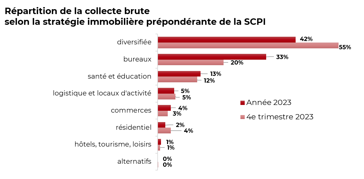 Au quatrième trimestre 2023, la collecte brute des SCPI s’établit à 1,24 milliard €, se rapprochant du volume du trimestre précédent (1,35 milliard €). La répartition de cette collecte reste inégale entre les différents acteurs du marché, avec une prédominance des SCPI « diversifiées », « santé et éducation » et « logistique et locaux d’activité », représentant près des trois quarts de la collecte brute trimestrielle, tandis que la part des SCPI « bureaux » diminue à 20 % (contre 33 % pour l’ensemble de l’année).