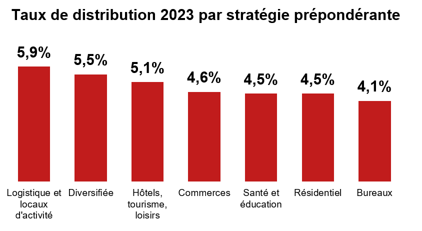 Les taux de distribution par catégorie de SCPI sont également stables par rapport à 2022, variant de 4,1 % pour les SCPI à prépondérance « bureaux » et à 5,9 % pour les SCPI à prépondérance « logistique et locaux d’activité ».