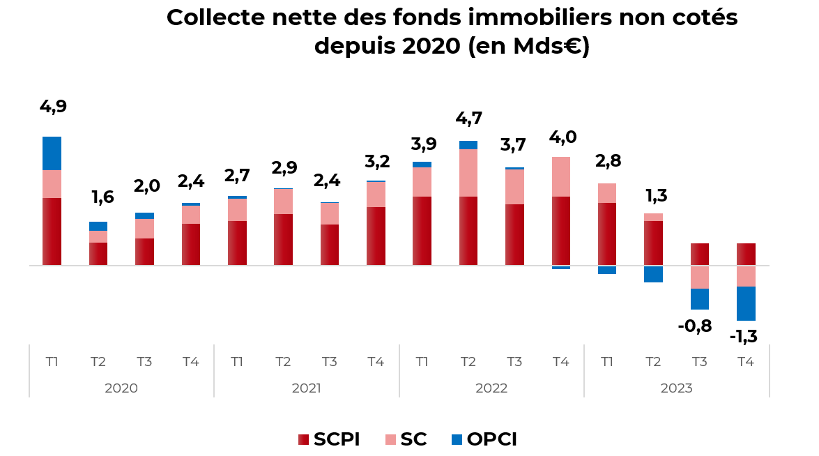 Au dernier trimestre 2023, les OPCI grand public ont décollecté de 1,3 milliard €, contre -791 millions € au trimestre précédent.